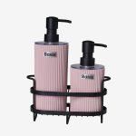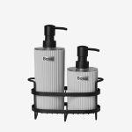 ست جامایع ۲ قلو گرافیک، راهحلی هوشمندانه برای نظمدهی به بطریهای مایع دستشویی یا ظرفشویی است. دو ظرف پمپدار خوشدست روی استندی با پایه فلزی مقاوم قرار گرفتهاند تا هر بطری جای مشخص خود را داشته باشد و فضای اطراف همیشه مرتب بماند. طراحی کاربردی این ست، استفاده روزمره را آسان و تمیزکاری آن را سریع و بدون دردسر میکند.