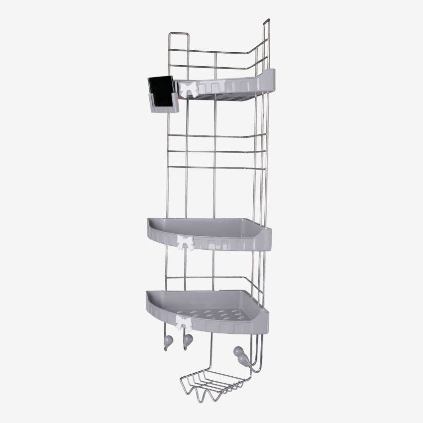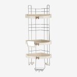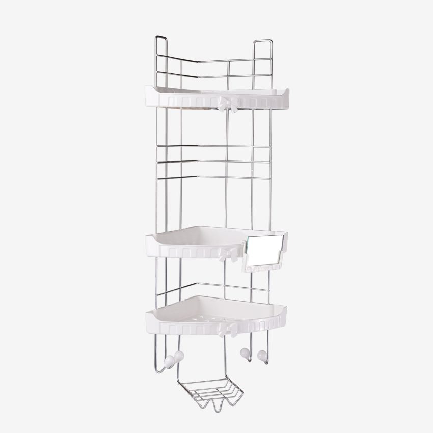 در بخش جلویی، یک آینهٔ ساده از گروه لوازم حمام، اما کاربردی تعبیه شده که برای مراقبتهای روزانه، اصلاح یا استفادهٔ شخصی، بسیار مفید خواهد بود. هر طبقه دارای سطح مشبک برای عبور آب است تا از جمع شدن رطوبت و باقیماندن آب جلوگیری شود. در پایینترین طبقه نیز یک جای صابونی جداگانه قرار دارد که به خشک ماندن صابون پس از استفاده کمک میکند. در قسمت پایین بدنه، چهار قلاب برای آویختن لیف یا سایر لوازم شخصی در نظر گرفته شده است؛ قابلیتی که این مدل را برای استفادهٔ خانوادگی بسیار مناسب میسازد. برای دیدن همه محصولات شلف حمام کلیک کنید.